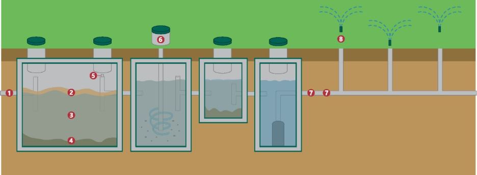 The effluent then flows into a second chamber, where it is further treated and sometimes filtered by an effluent screen (6). You can access both chambers by using the access riser (5). The effluent then goes through an outlet pipe (7) to be dispersed through a drainfield (8). The plants and soil in the field take care of the rest, thanks to their natural ability to remove contaminants.